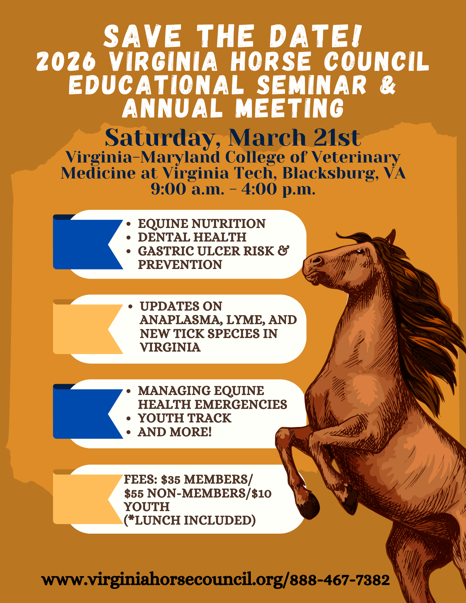 2026 Annual Meeting and Educational SeminarJanuary 17, 2026/in Informational Articles and News/by Laura Martlock TO REGISTER FOR THE SEMINAR, PLEASE CLICK HERE TO REGISTER FOR THE SEMINAR, PLEASE CLICK HERE https://www.virginiahorsecouncil.org/wp-content/uploads/2022/12/virginia-horse-council-logo.png 0 0 Laura Martlock https://www.virginiahorsecouncil.org/wp-content/uploads/2022/12/virginia-horse-council-logo.png Laura Martlock2026-01-17 19:40:452026-01-17 20:44:122026 Annual Meeting and Educational Seminar